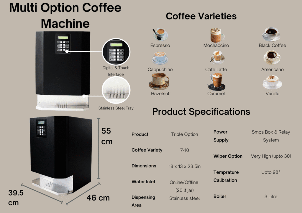 A multi-option vending machine is a smart, fully automatic coffee solution designed to serve 7–10 café-style beverages at the touch of a button. It offers a wide selection including Espresso, Cappuccino, Mochaccino, Café Latte, Americano, Black Coffee, and flavored options such as Hazelnut, Caramel, Vanilla, and Irish.